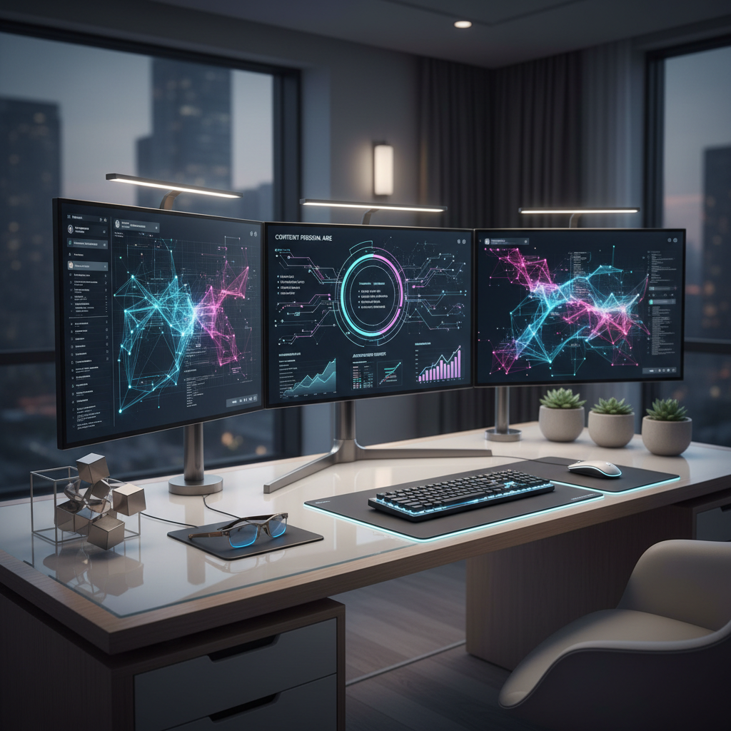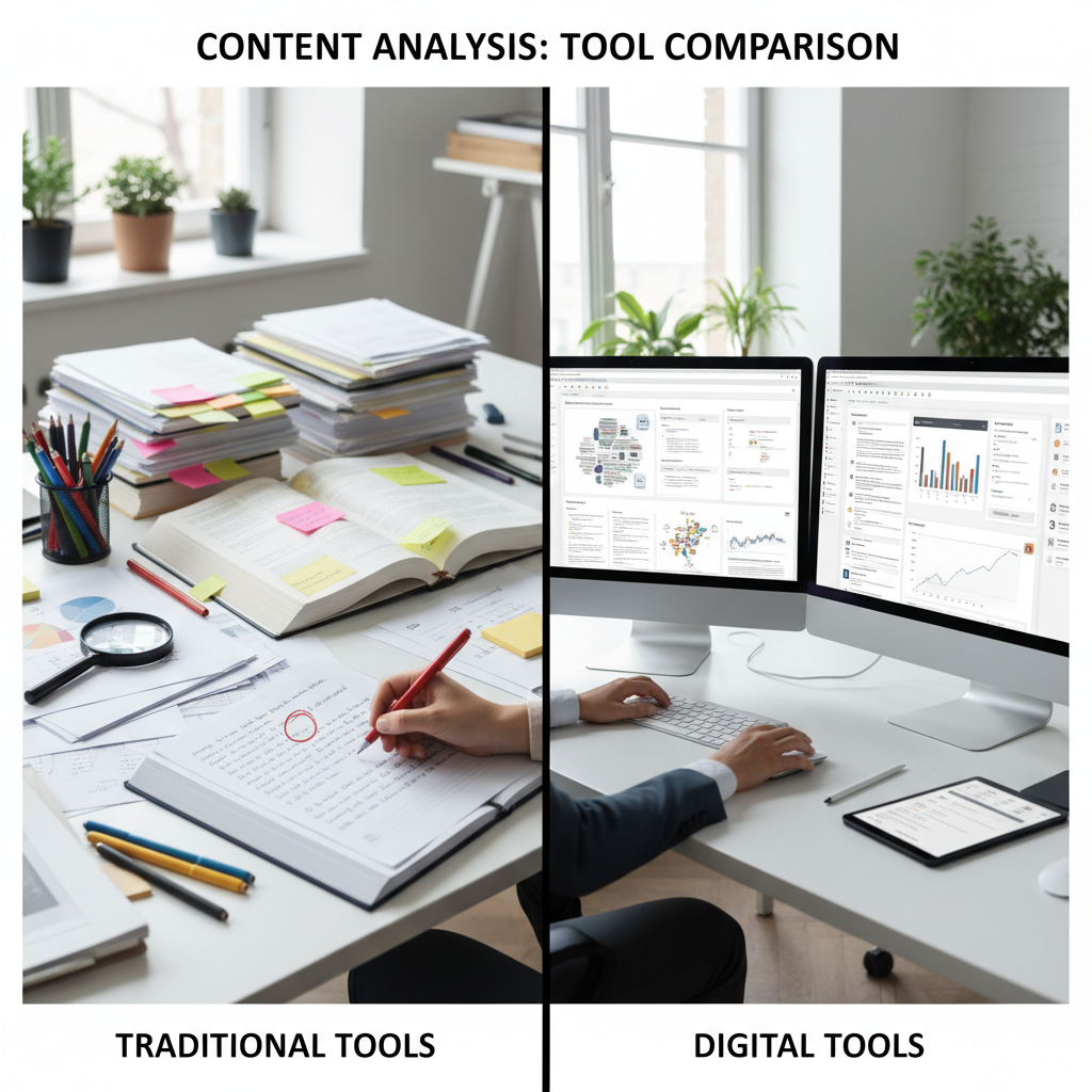 Ekspert analizuje dane treści w nowoczesnym biurze, wykorzystując narzędzia analizy treści i sztuczną inteligencję