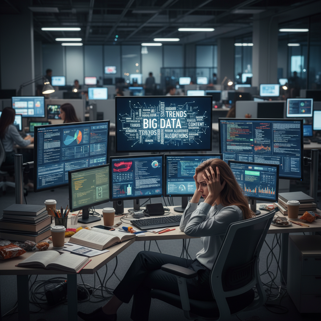 Marketer analizuje zbyt dużą ilość danych na ekranie, zagubiony w nadmiarze informacji o analizie treści