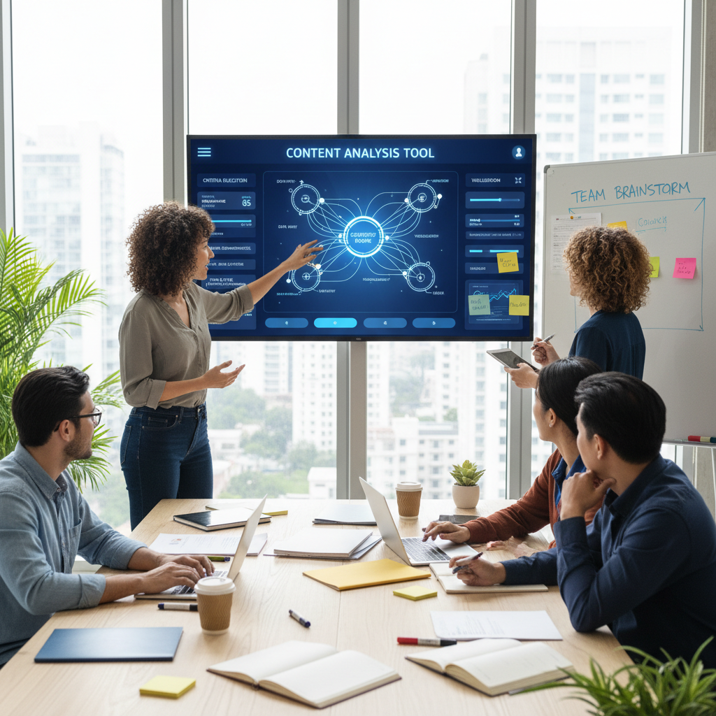 Zespół podczas burzy mózgów wybierający narzędzie do analizy treści, analizując kluczowe kryteria wyboru