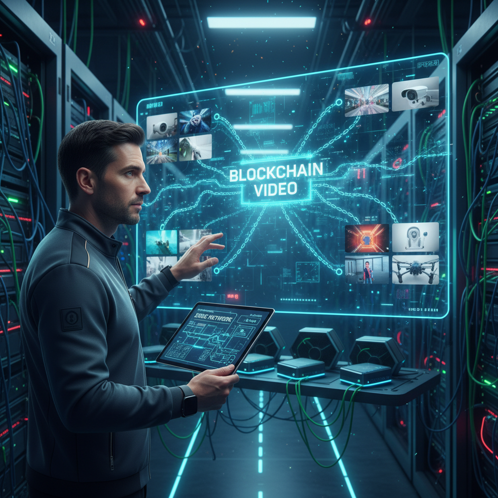 Zdjęcie: Inżynier przy komputerze z symbolami blockchain i edge computing. Alt: Inżynier AI pracujący z technologiami edge i blockchain w analizie treści wideo.