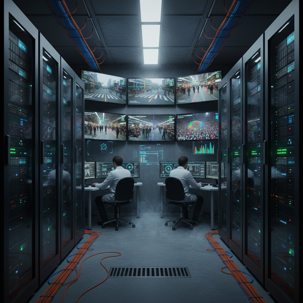 Zdjęcie: Energooszczędna serwerownia z monitorami prezentującymi analizę wideo. Alt: Serwerownia AI analizująca treści wideo na żywo.