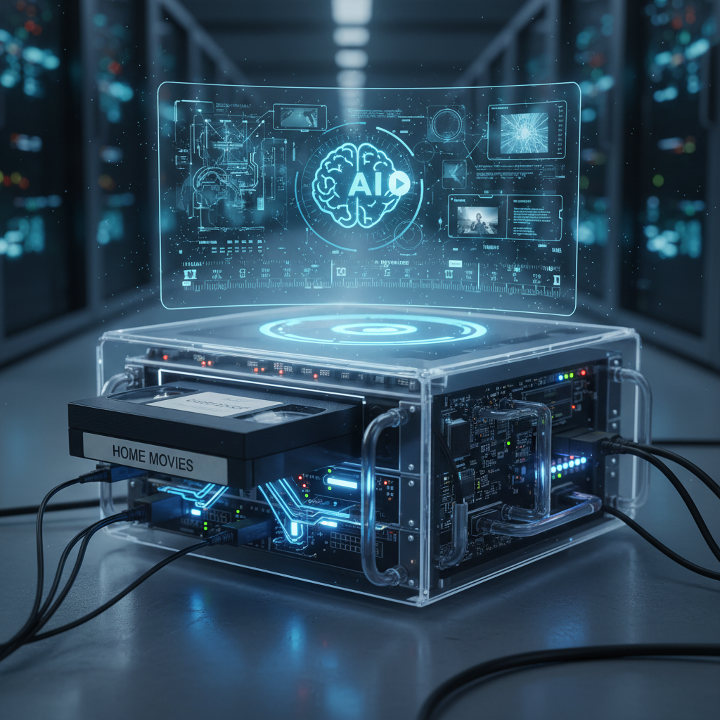 Zdjęcie: Kasety wideo na tle serwerowni pełnej sprzętu AI. Alt: Przemiana od tradycyjnych kaset po nowoczesne serwery AI do rozpoznawania treści wideo.