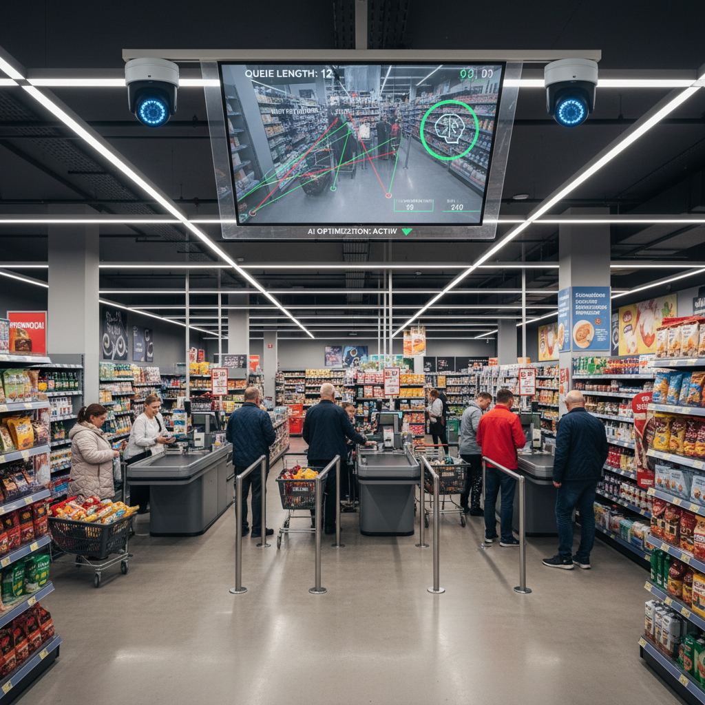 Zdjęcie: Kolejka w supermarketcie obserwowana przez kamery AI. Alt: AI monitoruje kolejkę klientów w polskim sklepie.